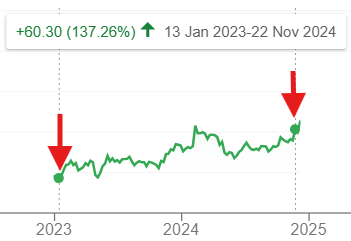 I entered this particular share when it was $39 back in early 2023. I made almost triple my money at the end of 2024. Sounds like a good return, doesn’t it? Well, I thought so at that time…